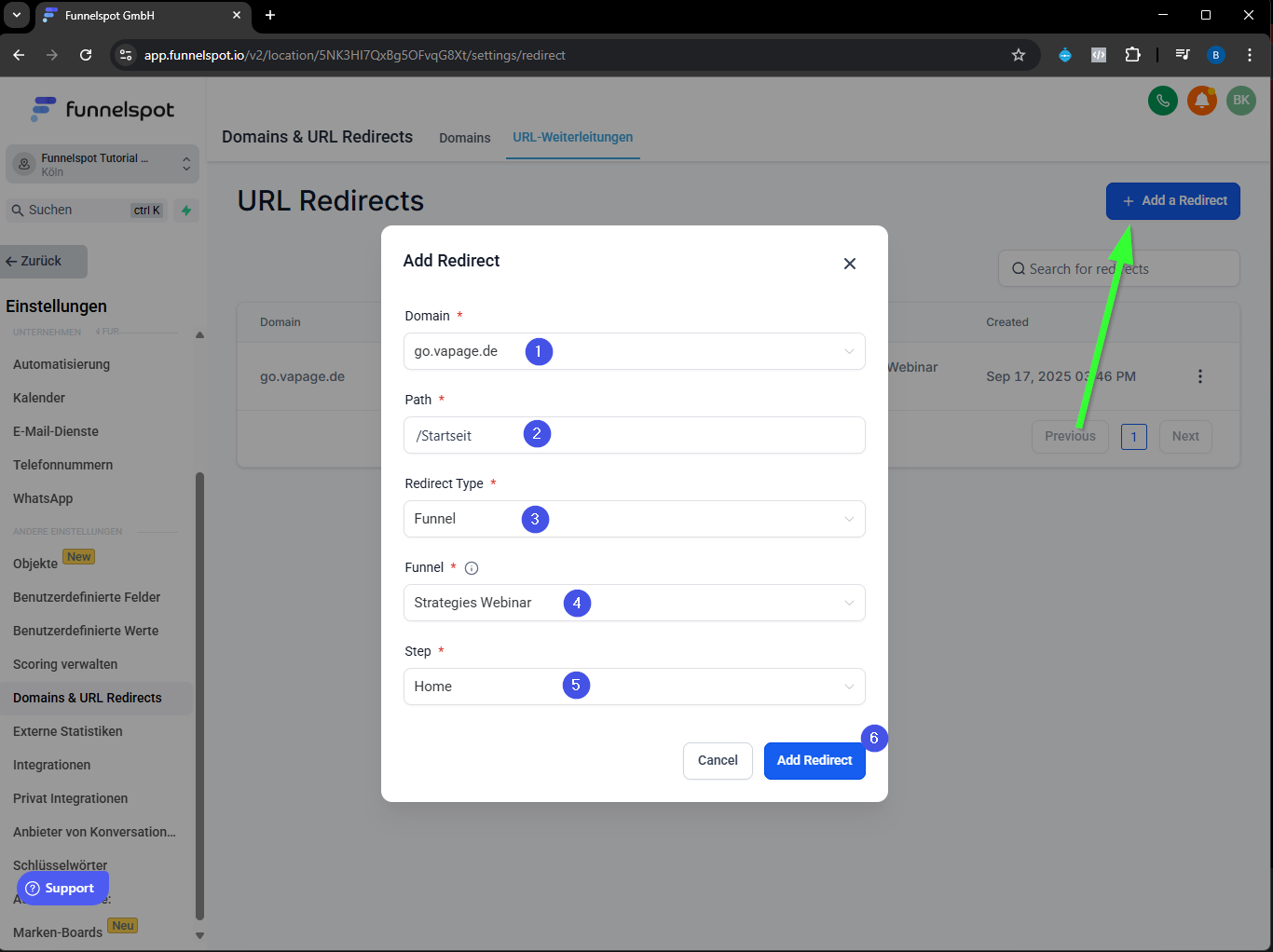 Klicke auf „Add redirect“ (6), um die Weiterleitung zu speichern.
