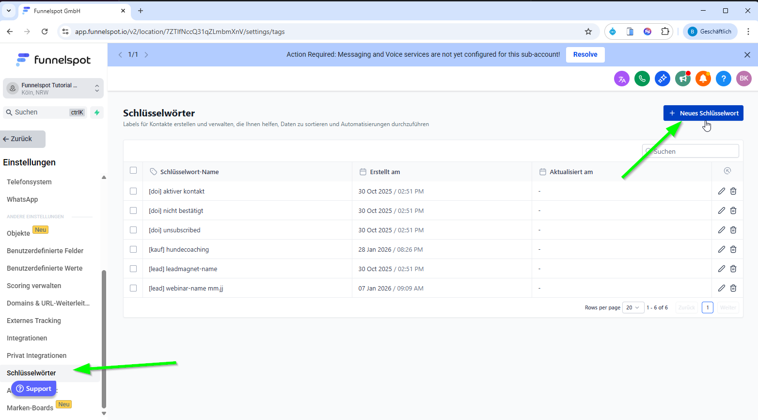 Gehe zu Einstellungen → Schlüsselwörter (Tags).