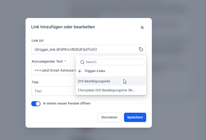 | Klick wird nicht erkannt | DOI-E-Mail linkt nicht auf Triggerlink, sondern auf eine „normale URL“ | In der E-Mail Triggerlink auswählen (Marketing → Triggerlinks) |