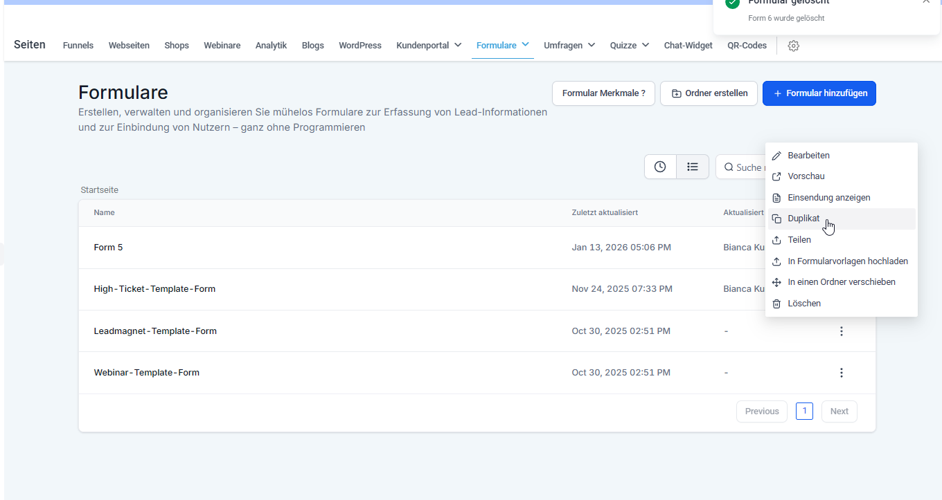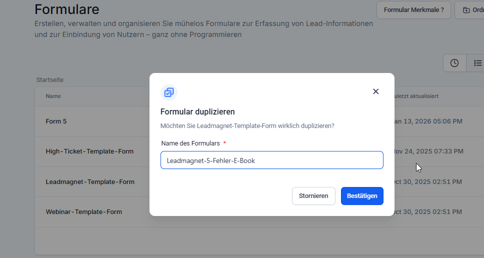 Formular für Leadmagnet oder Webinar anlegen --> Kopiere dir hierzu die jeweilige Vorlage.