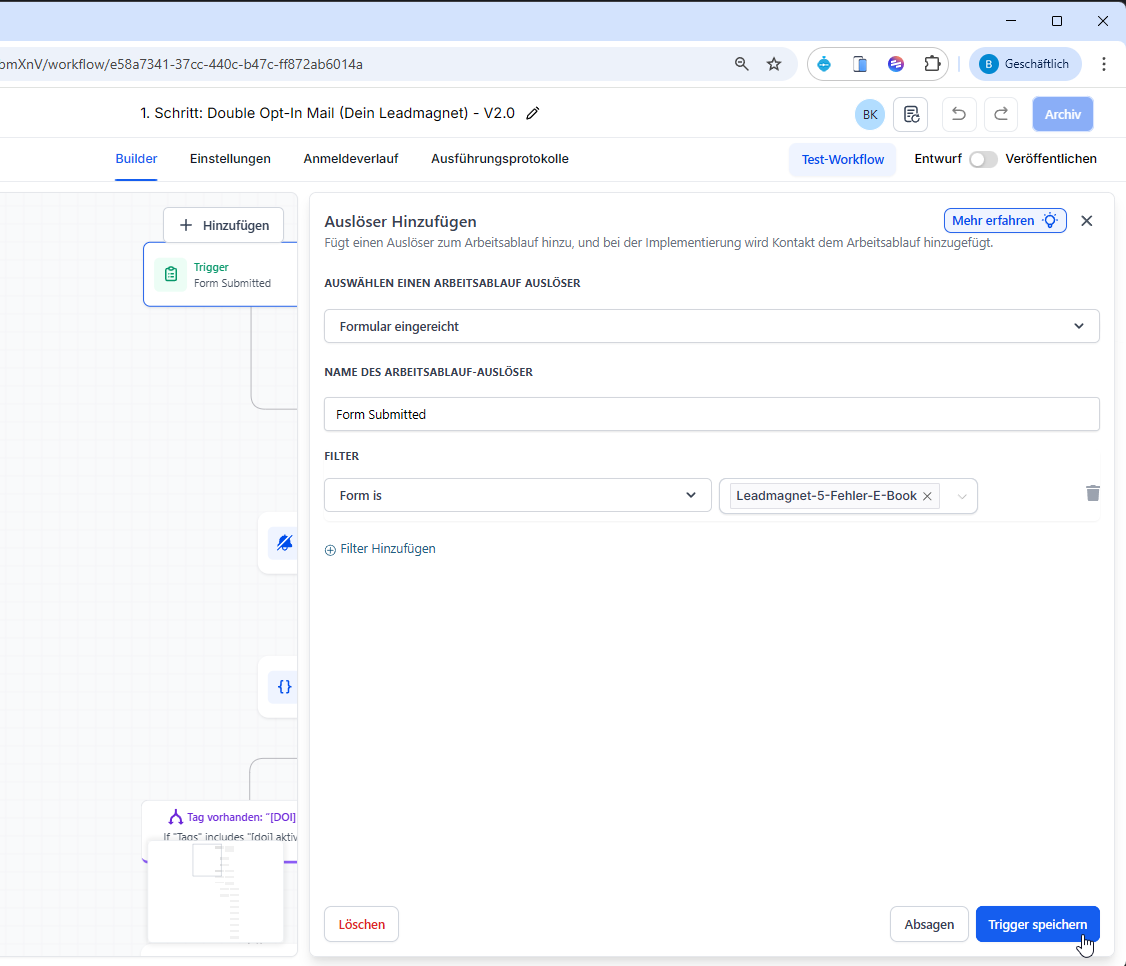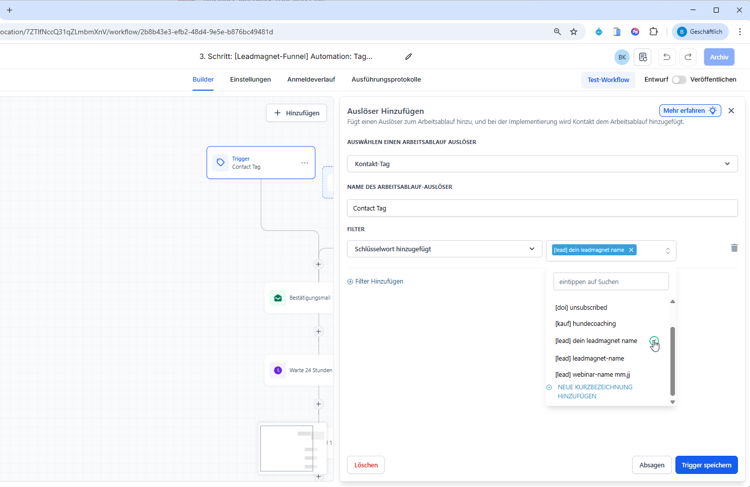 Dieser Schritt wird ausgelöst, sobald der Kontakt den Lead-Tag erhalten hat (muss daher pro Funnel neu gemacht werden).