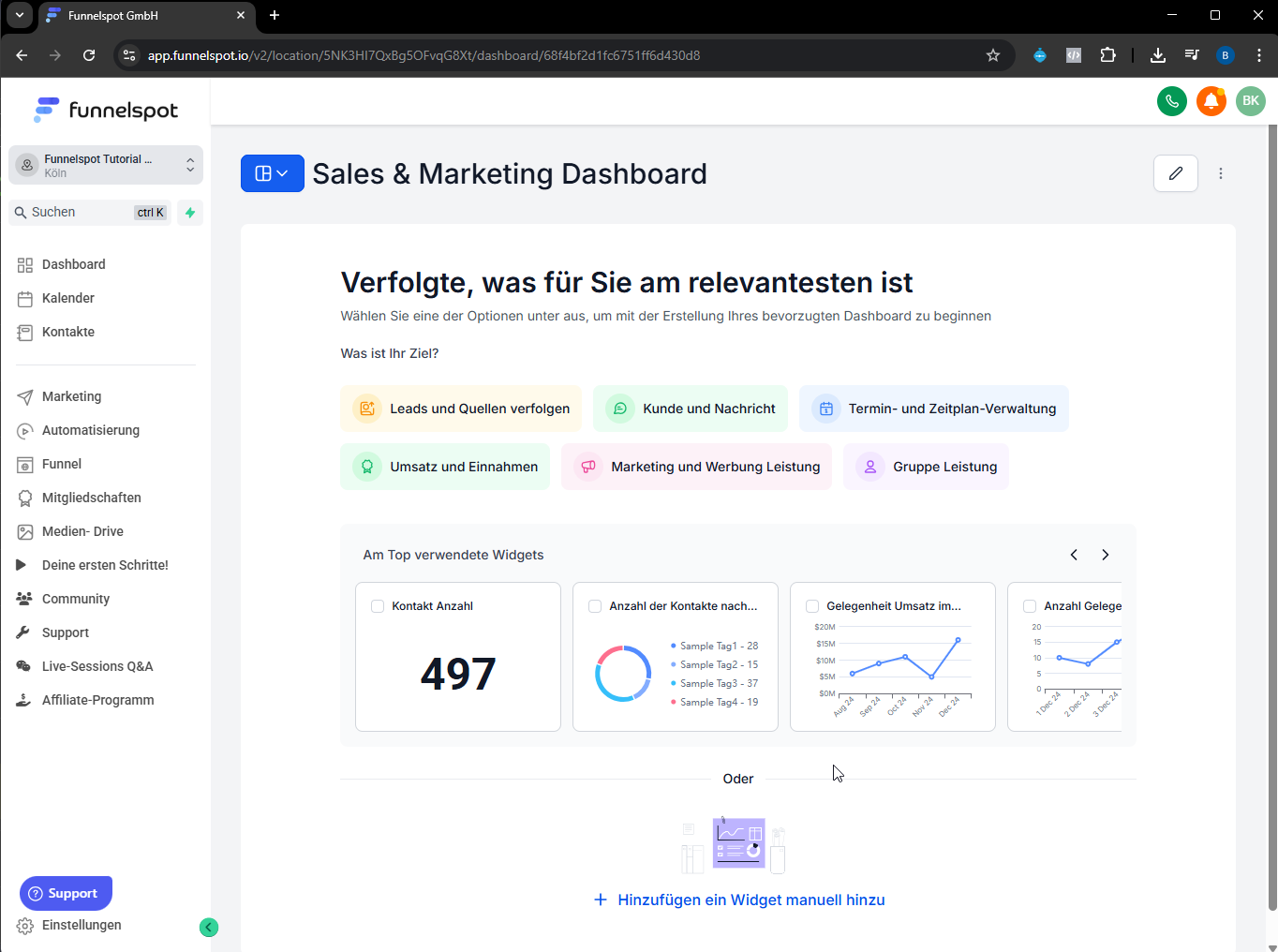 Nach dem Anlegen zeigt Funnelspot vordefinierte Widget-Kategorien. Du kannst beliebig kombinieren: