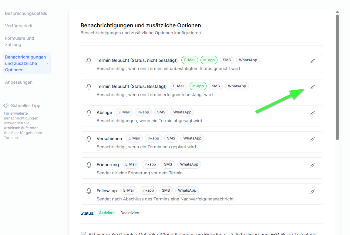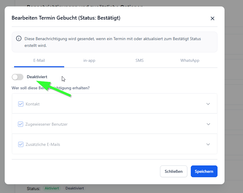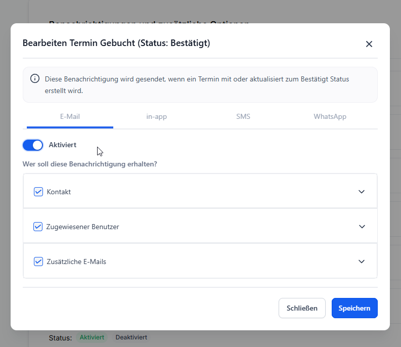 Wähle die Benachrichtigung Appointment booked – Status confirmed / Termin gebucht (Status bestätigt)