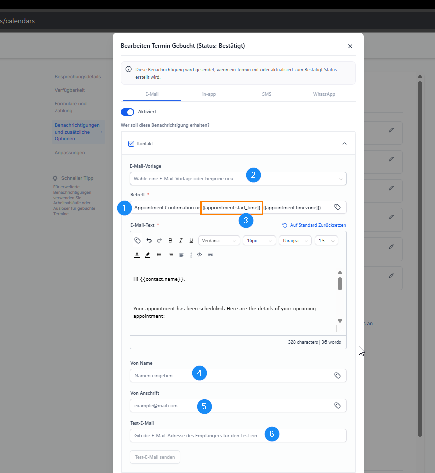 Lege den E-Mail-Betreff (1) fest (z. B. „Dein Termin ist gebucht“).