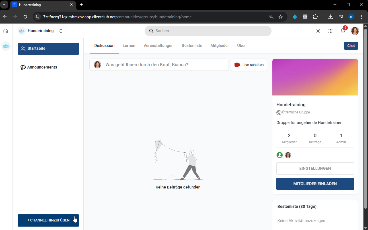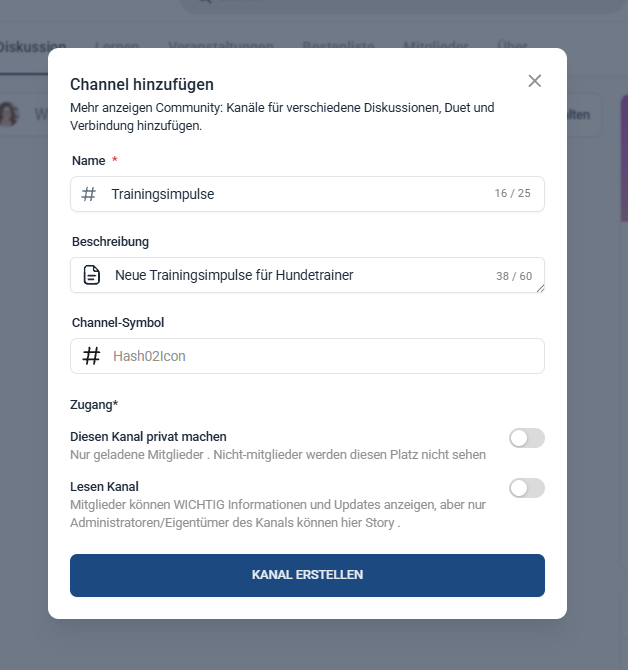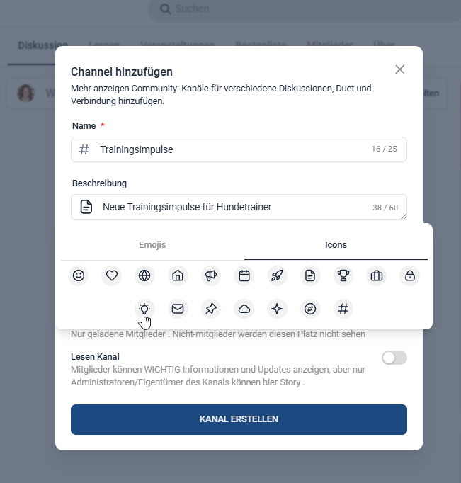 Klicke im Diskussion-Bereich auf Neuen Kanal erstellen.