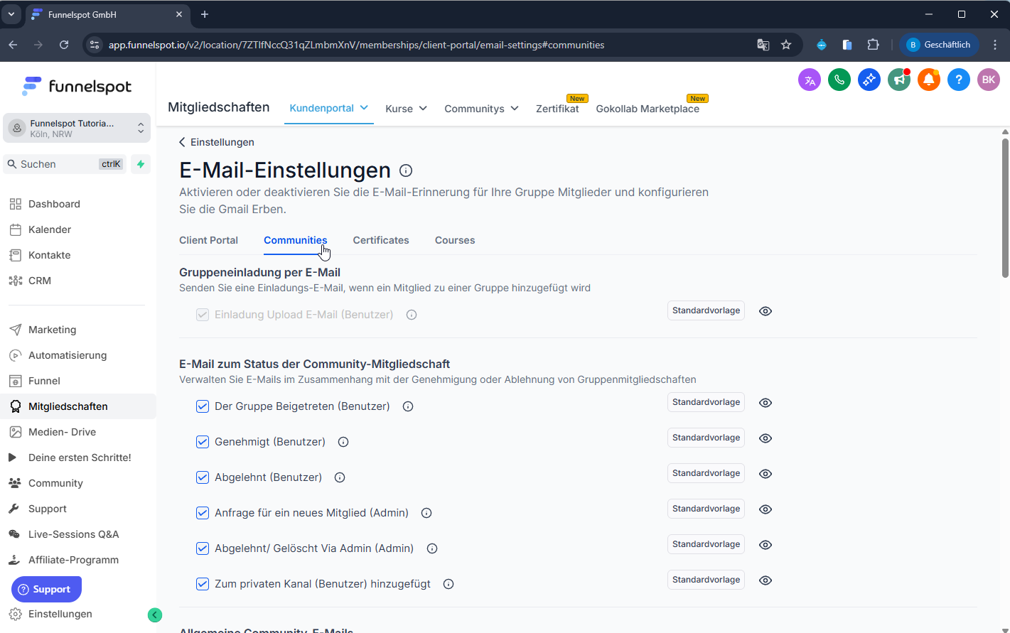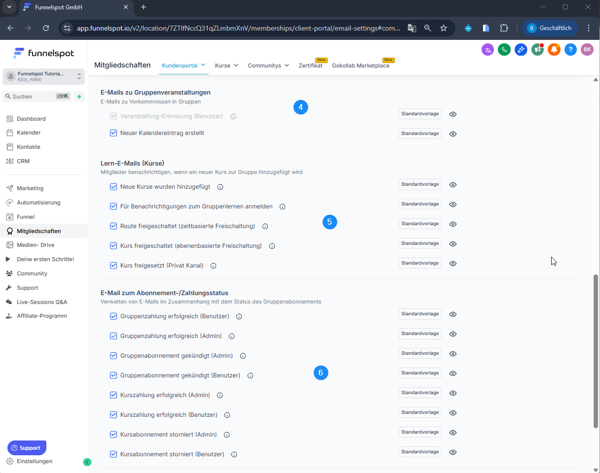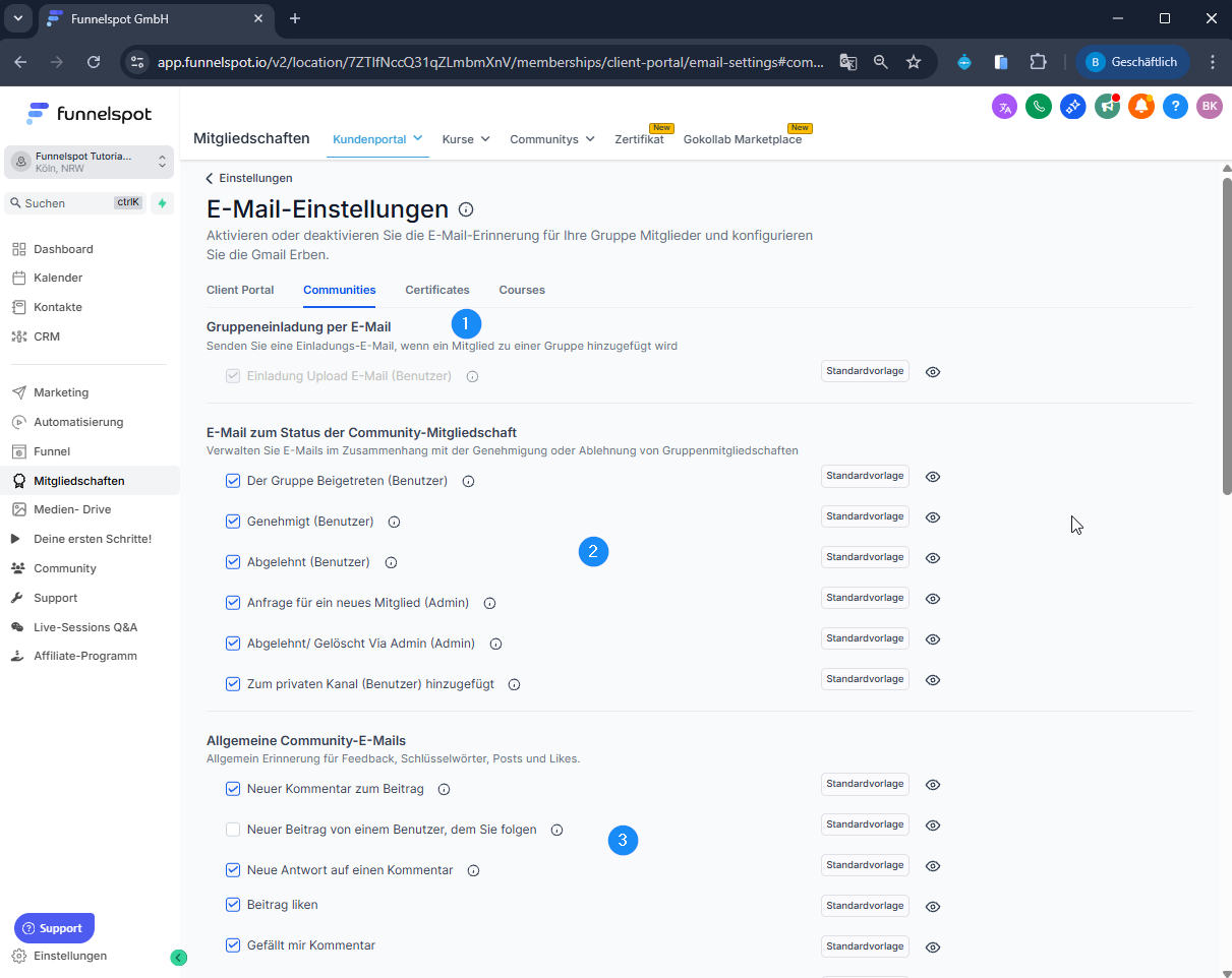 Diese SOP beschreibt, wie du in Funnelspot die E-Mail-Benachrichtigungen für deine Community konfigurierst – inklusive Einladungen, Status-Mails, Aktivitäts-Notifications und Kurs-Benachrichtigungen.