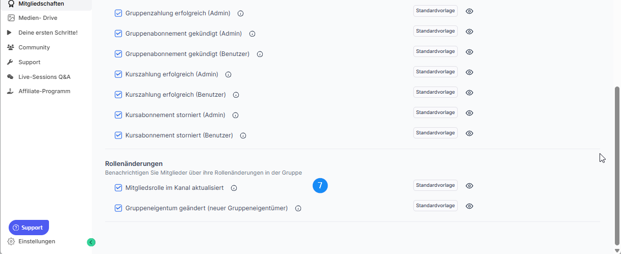 Wichtige Info: In Klammer hinter der jeweiligen Benachrichtigung steht, an wen die Nachricht geht. Benutzer sind immer die Mitglieder deiner Community, Admin die Personen, die deine Community verwalten (zunächst wirst das du sein, du kannst aber auch deine Mitarbeitenden als Admins einfügen).