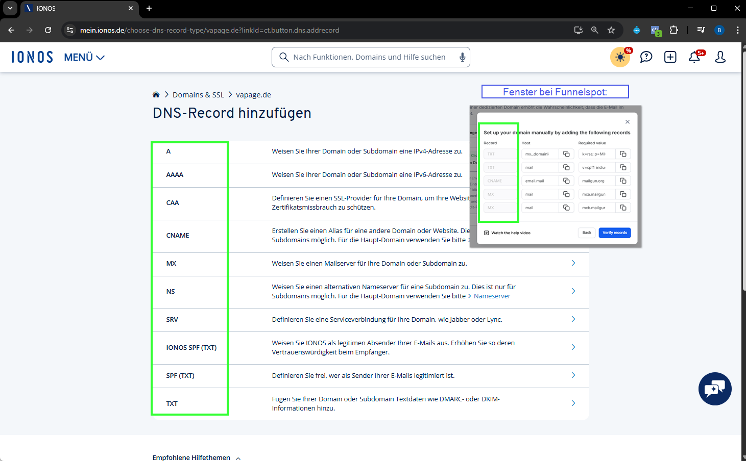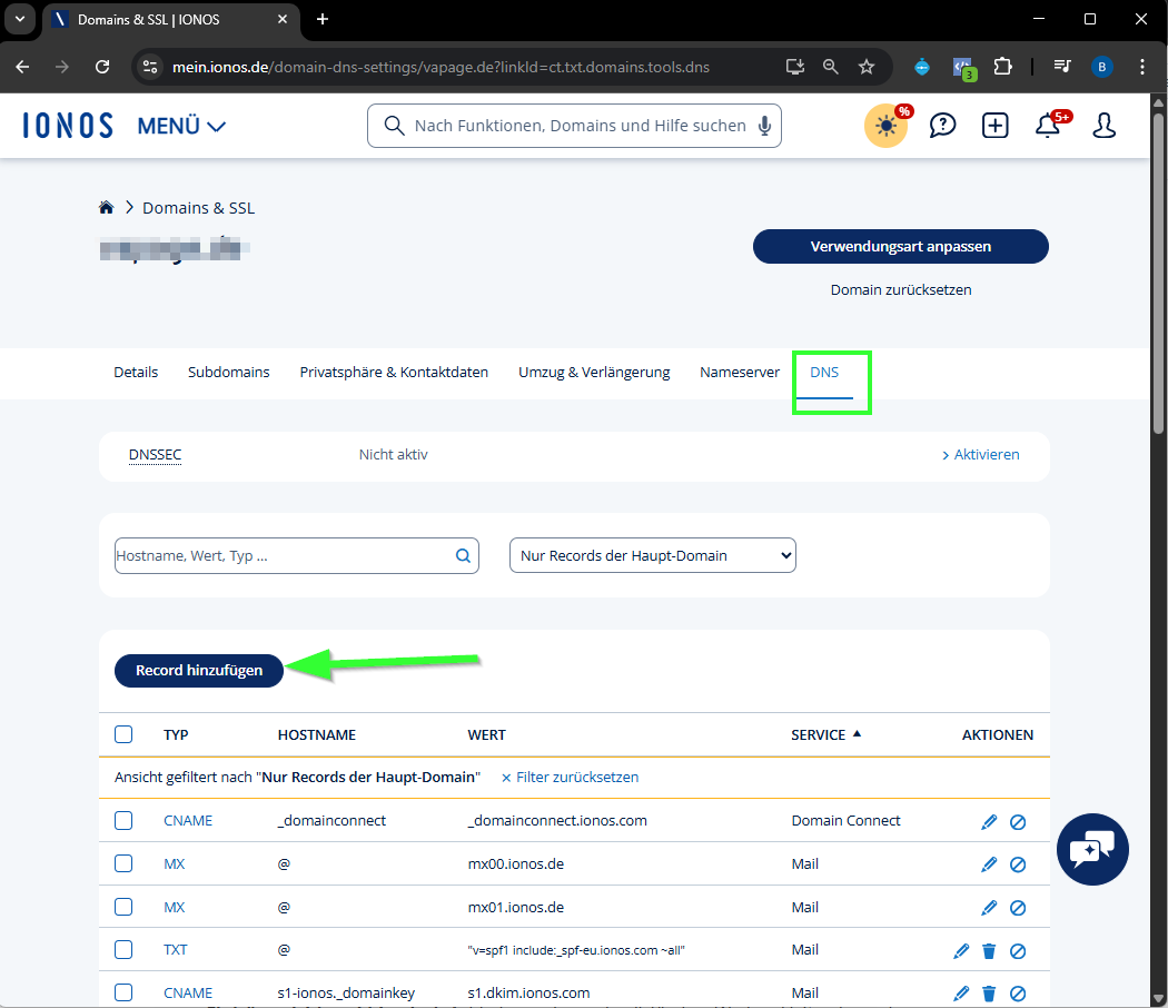 Öffne den Bereich „DNS-Einstellungen“ / „DNS Records“ / „Einträge verwalten“