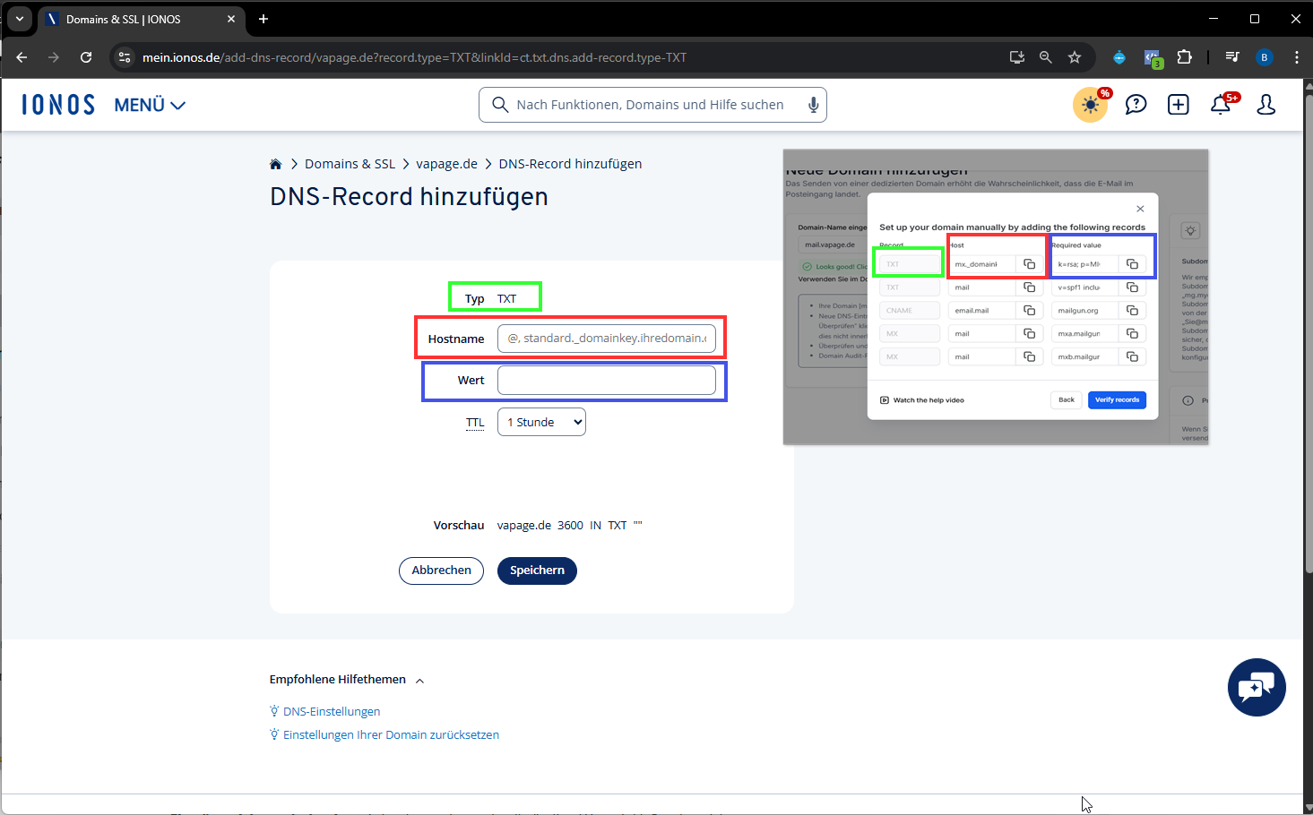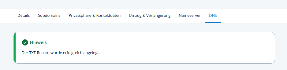 TXT | SPF + DKIM-Einträge zur Sender-Authentifizierung | Host & Wert 1 kopieren, als neuen TXT-Record eintragen |