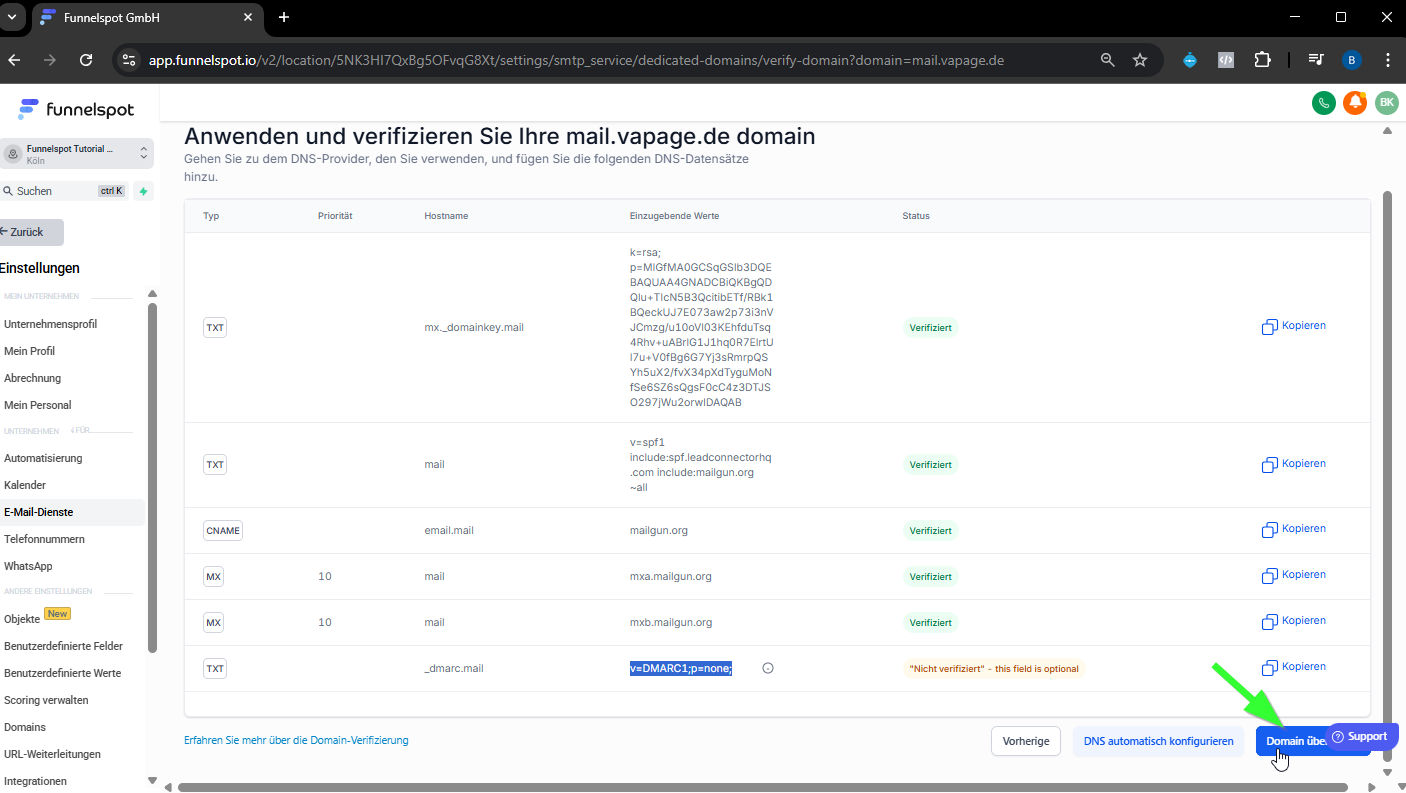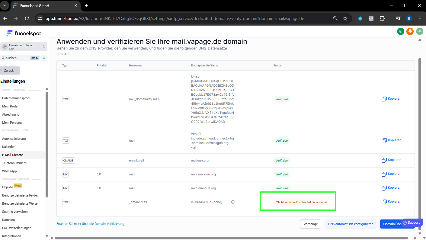 Es werden mehrere DNS-Einträge angezeigt (TXT, CNAME, MX, DMARC)