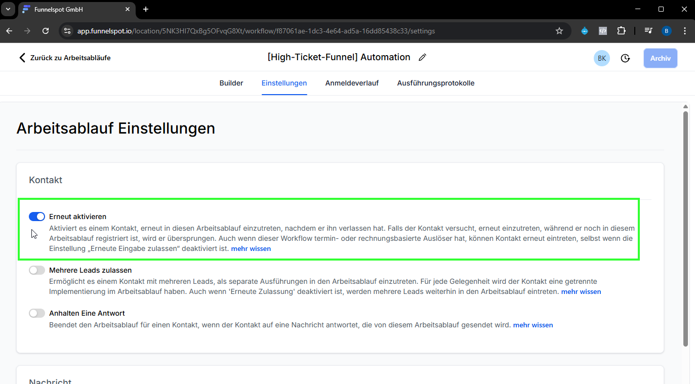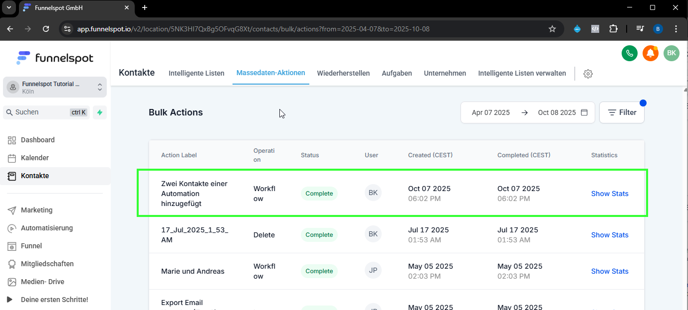 Die ausgewählten Kontakte wurden erfolgreich zur gewählten Automation in Funnelspot hinzugefügt und durchlaufen nun den definierten Workflow (z. B. E-Mail-Sequenzen, Tags, Aufgaben etc.).