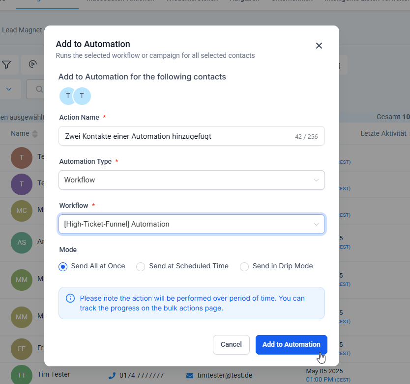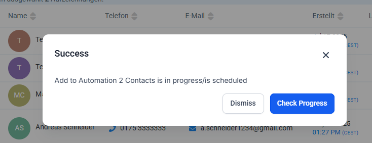 Nachdem du die Kontakte hinzugefügt hast, zeigt Funnelspot die Meldung „Add to Automations ANZAHL Contacts is in progress/is scheduled“ an.