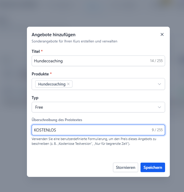 Vergib einen Angebotsnamen (z. B. „Hunde Coaching Angebot“).