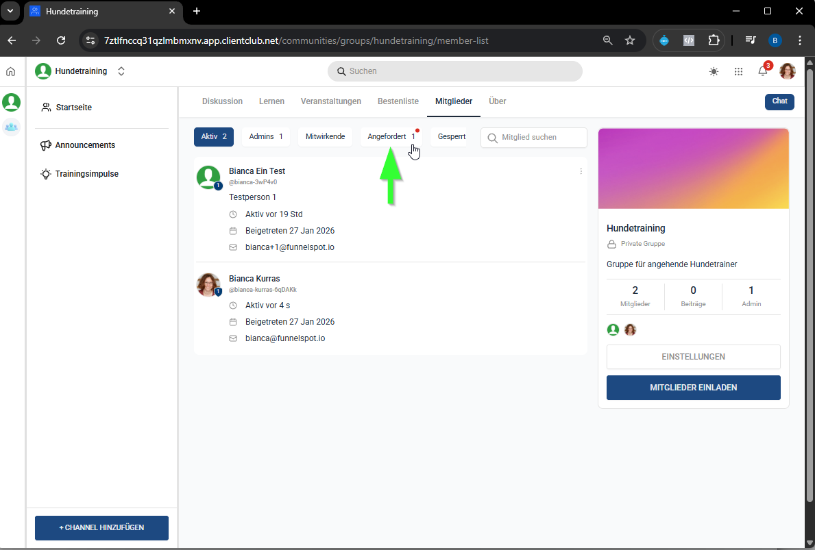 Wechsle im Members-Bereich auf den Tab Requested / Angefordert