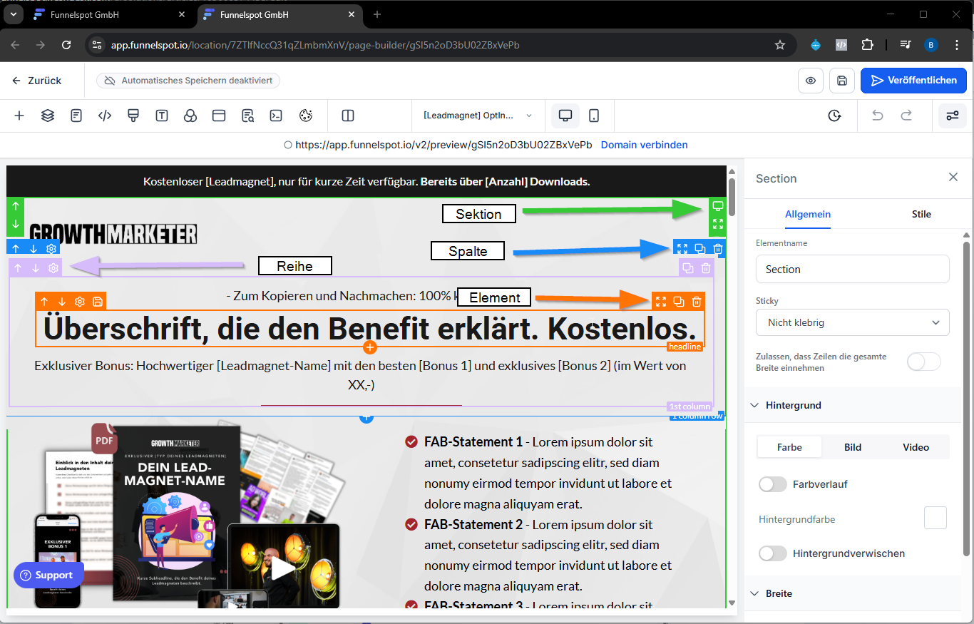 Im Funnelspot-Builder die zu bearbeitende Seite öffnen (z. B. eine Opt-in-Seite).