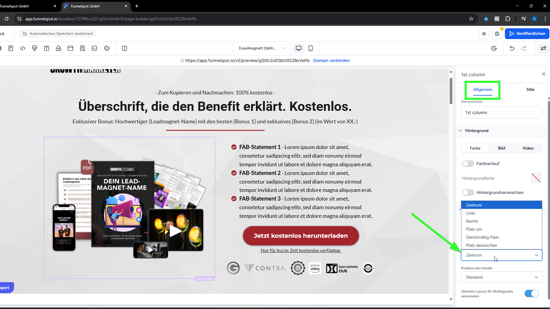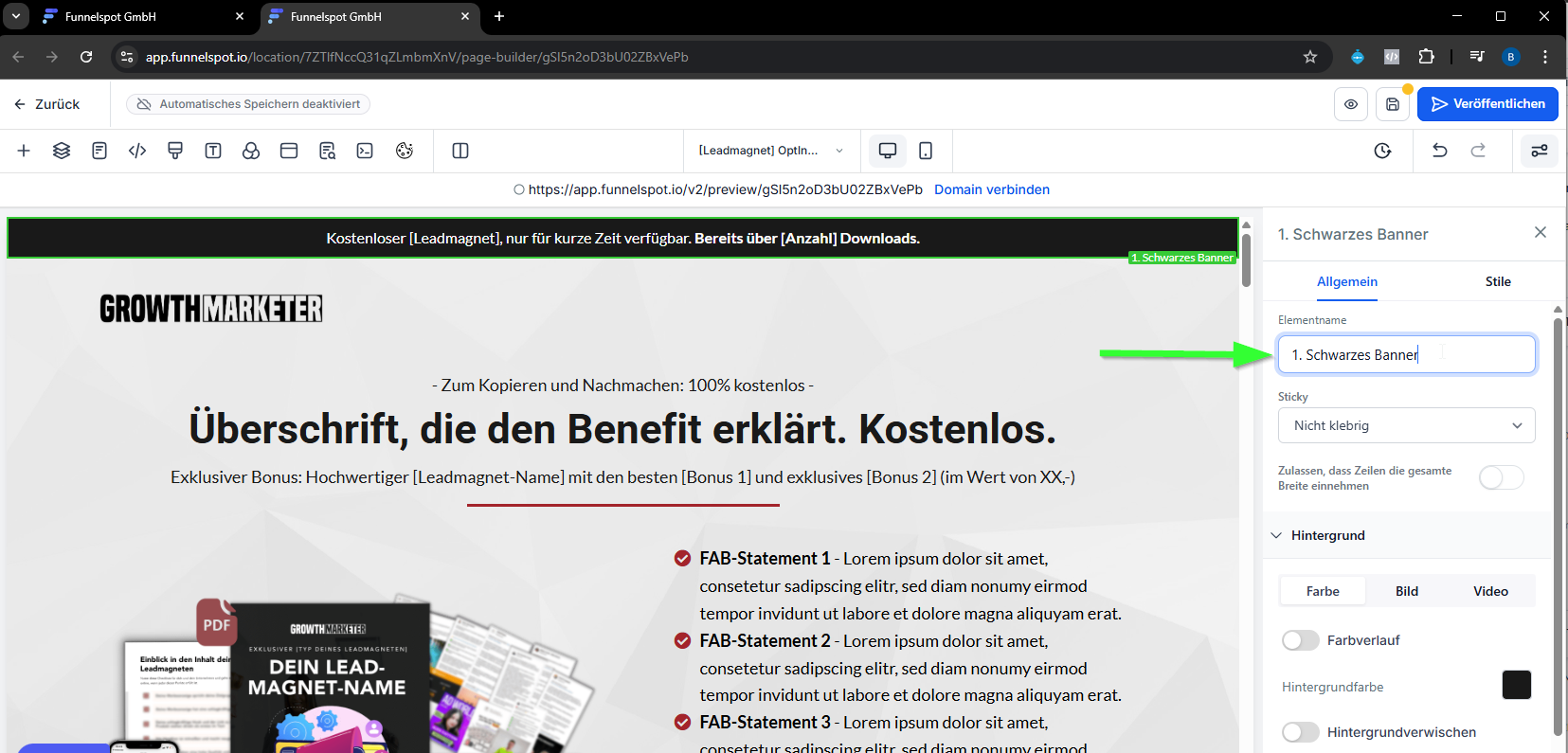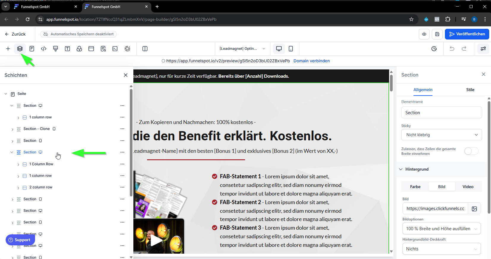 Im Funnelspot-Builder die zu bearbeitende Seite öffnen (z. B. eine Opt-in-Seite).