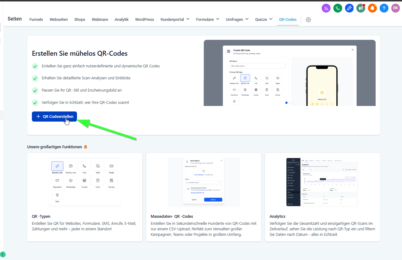 Oben im Menü auf „QR-Codes“ gehen.
